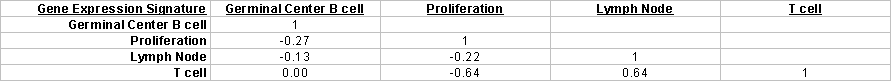 of various average gene expression signatures (see legend to Table 1) and overall length of survival in DLBCL. The proliferation, T cell and lymph