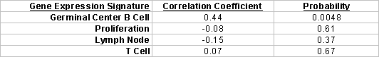 node signatures did not strongly correlate with overall survival while the germinal center B cell signature did, with high statistical significance